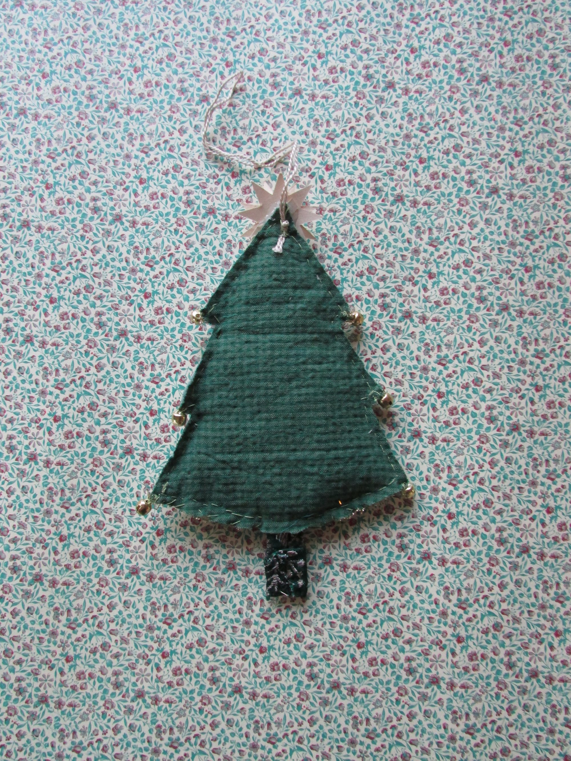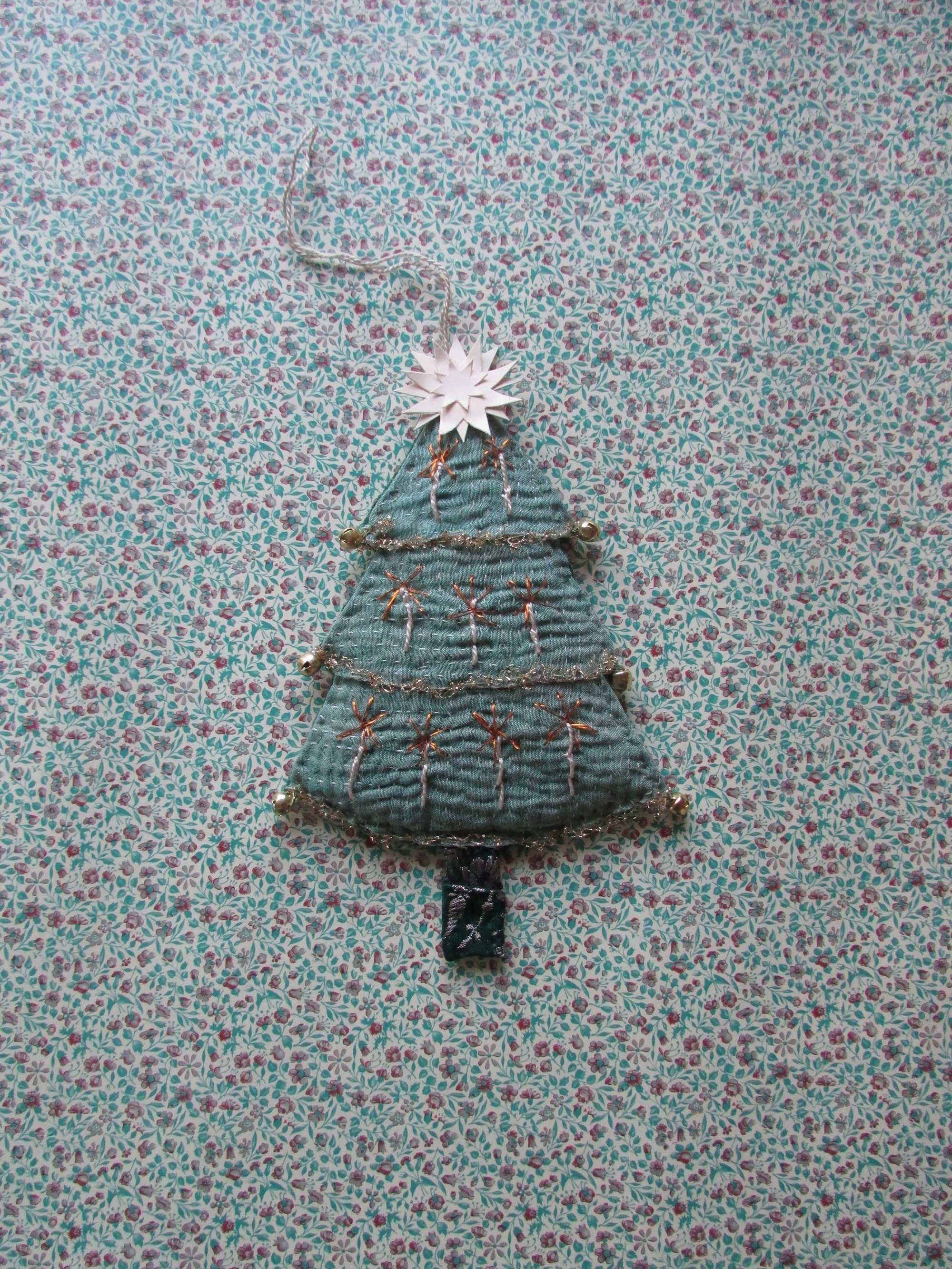Christmas tree ornament with embroidery, handmade by me. Made with vintage sari fabric and vintage paper star. Size 17 cm x 10,5 cm