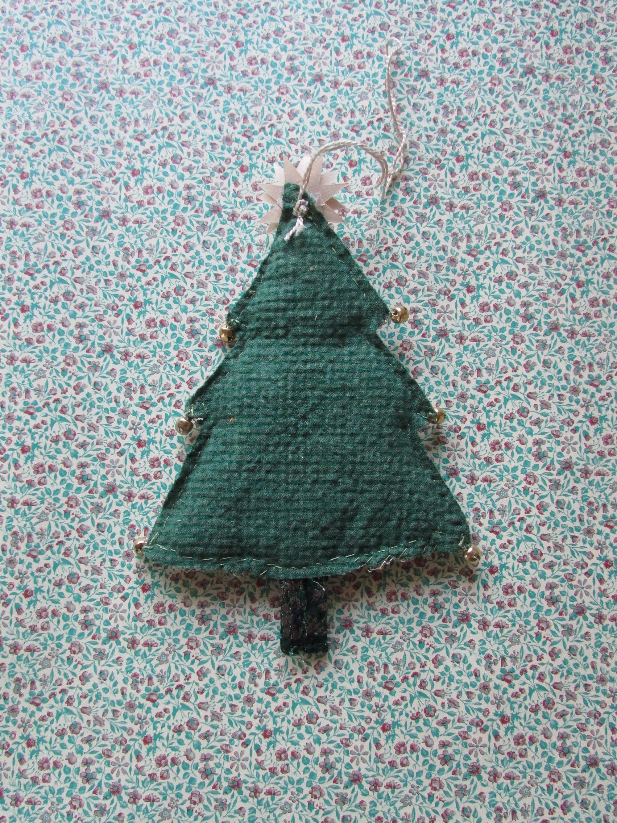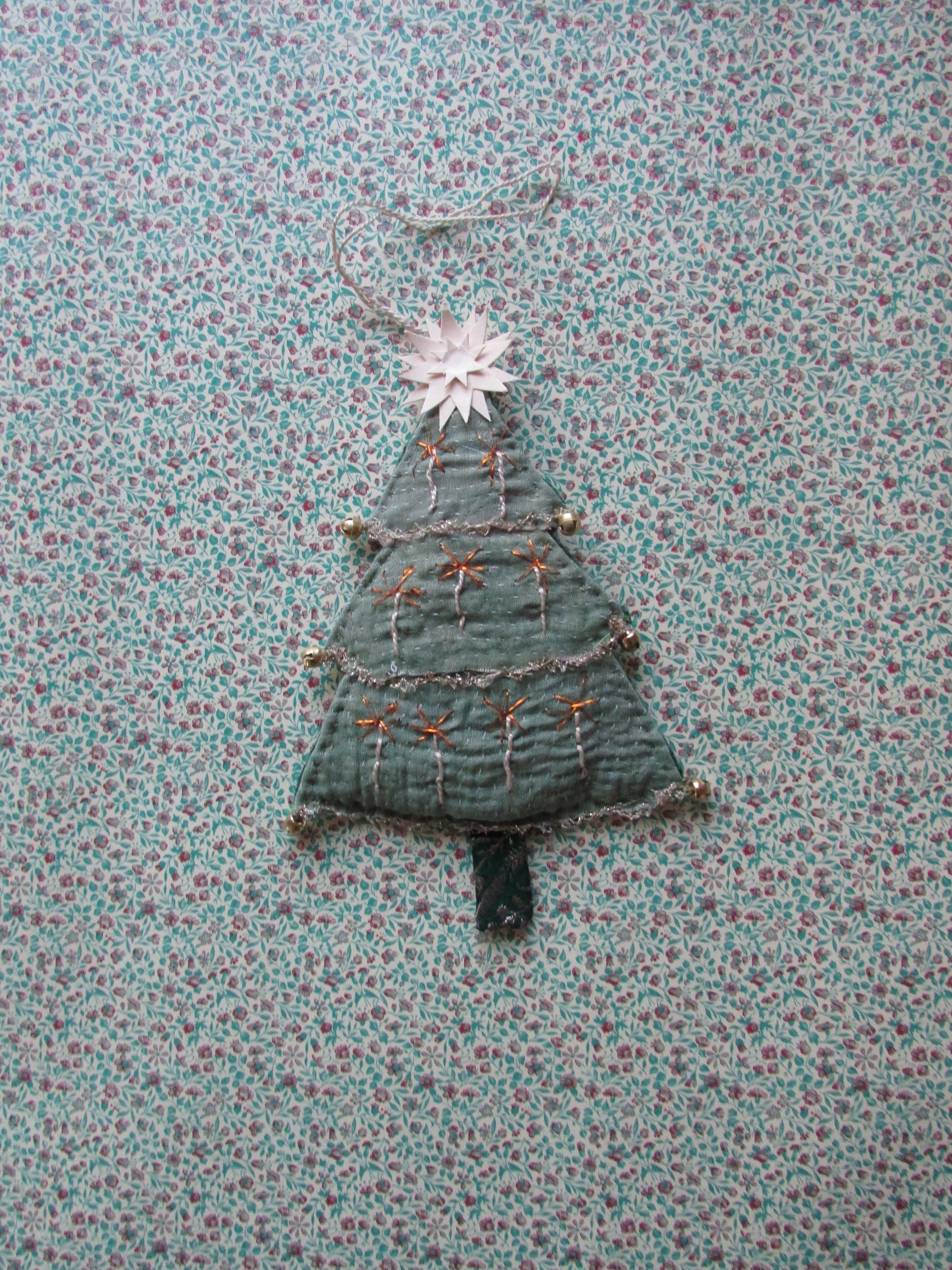 Christmas tree ornament with embroidery, handmade by me. Made with vintage sari fabric and vintage paper star. Size 17 cm x 11 cm